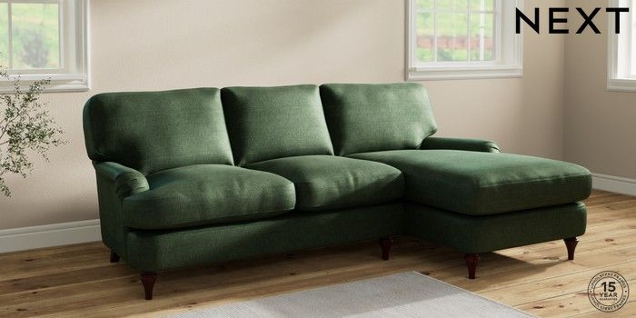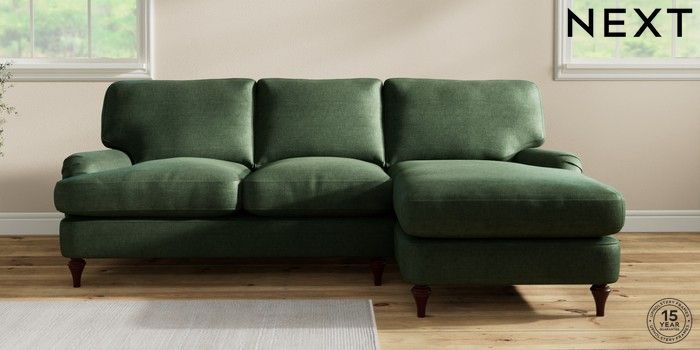 7.2.10 Sadie Deep Relaxed Sit Medium Sofa Chaise - Right Hand Luxe Chenille Dark Green High Slim Turned - Dark Brown | Made Click here to use our website with more accessibility support, for example screen readers