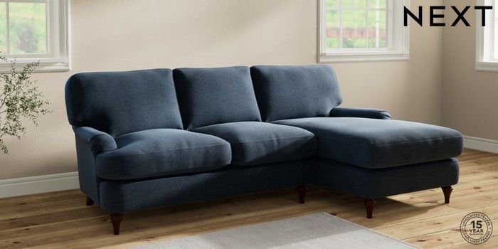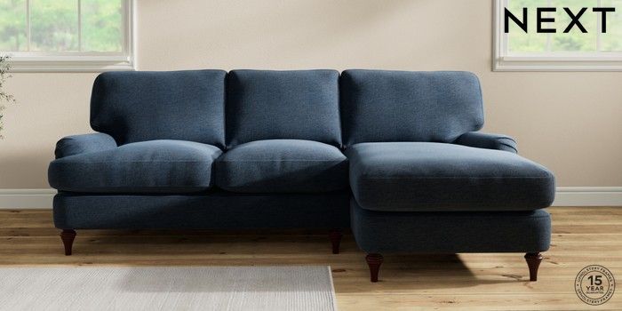 7.2.10 Sadie Deep Relaxed Sit Medium Sofa Chaise - Right Hand Ripple Chenille Dark Blue High Slim Turned - Dark Brown | Made Click here to use our website with more accessibility support, for example screen readers