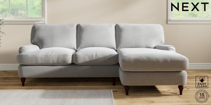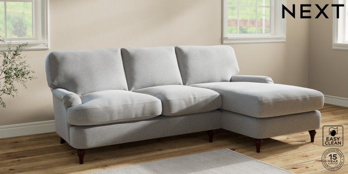 7.2.10 Sadie Deep Relaxed Sit Medium Sofa Chaise - Right Hand Tweedy Blend Easy Clean Light Silver Grey High Slim Turned - Dark Brown | Made Click here to use our website with more accessibility support, for example screen readers