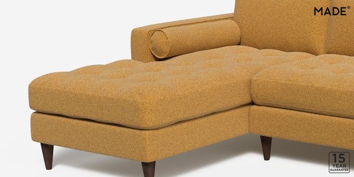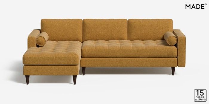 6.12.1 Scott by Made Medium Sofa Chaise - Left Hand Soft Touch Boucle Ochre Yellow Tapered - Walnut | Made Click here to use our website with more accessibility support, for example screen readers