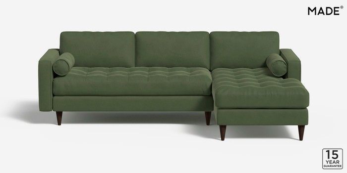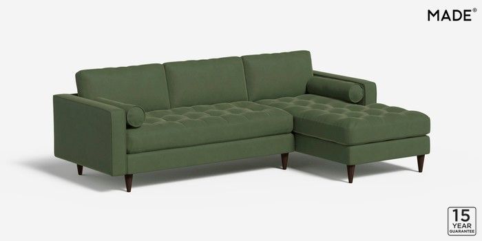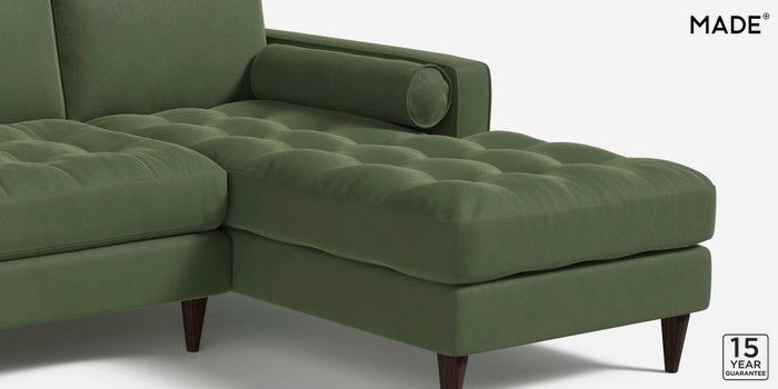 6.12.1 Scott by Made Medium Sofa Chaise - Right Hand Matt Velvet Easy Clean Grass Green Tapered - Walnut | Made Click here to use our website with more accessibility support, for example screen readers