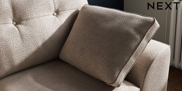 7.2.10 Stamford Buttoned Back 2 Seater Small Sofa Boucle Chenille Light Natural Large Square Angle - Chrome Metal | Made Click here to use our website with more accessibility support, for example screen readers