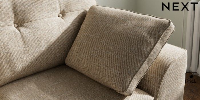 7.2.10 Stamford Buttoned Back 2 Seater Small Sofa Boucle Weave Easy Clean Dark Natural Large Square Angle - Chrome Metal | Made Click here to use our website with more accessibility support, for example screen readers