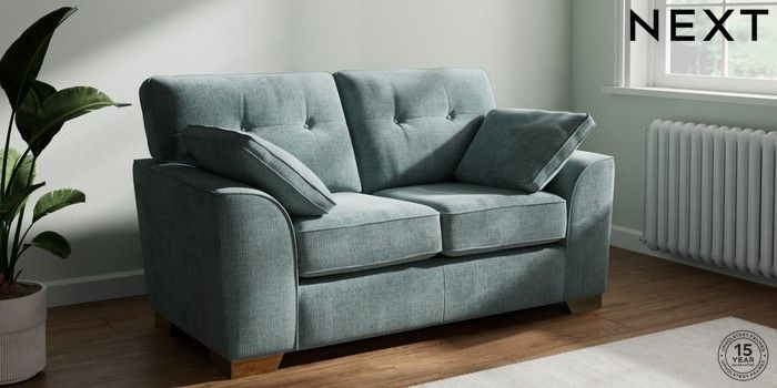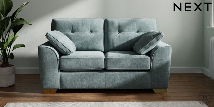 7.2.10 Stamford Buttoned Back 2 Seater Small Sofa Chunky Chenille Light Teal Green Large Square Angle - Brushed Brass | Made Click here to use our website with more accessibility support, for example screen readers