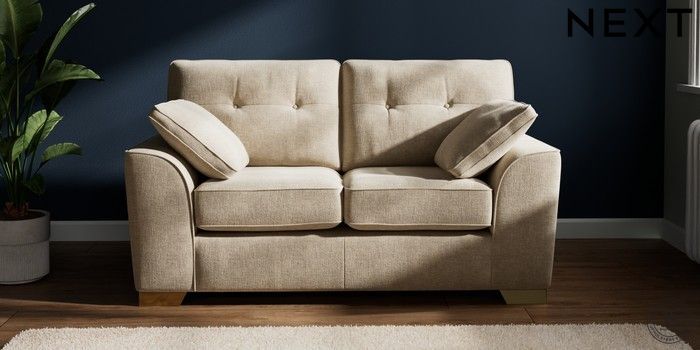 7.2.10 Stamford Buttoned Back 2 Seater Small Sofa Chunky Weave Cream Large Square Angle - Brushed Brass | Made Click here to use our website with more accessibility support, for example screen readers
