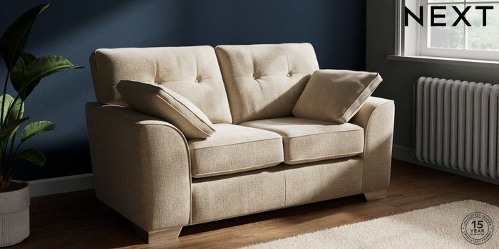 7.2.10 Stamford Buttoned Back 2 Seater Small Sofa Chunky Weave Cream Large Square Angle - Chrome Metal | Made Click here to use our website with more accessibility support, for example screen readers