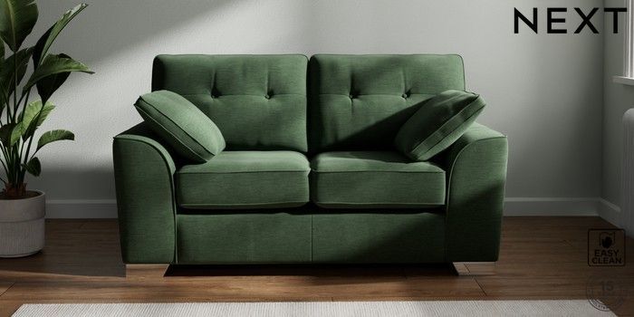 7.2.10 Stamford Buttoned Back 2 Seater Small Sofa Fine Chenille Easy Clean Mid Khaki Green Large Square Angle - Chrome Metal | Made Click here to use our website with more accessibility support, for example screen readers