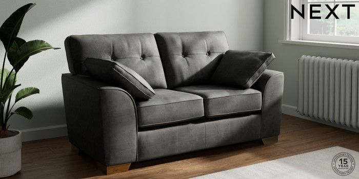 7.2.10 Stamford Buttoned Back 2 Seater Small Sofa Monza Faux Leather Easy Clean Dark Grey Large Square Angle - Brushed Brass | Made Click here to use our website with more accessibility support, for example screen readers