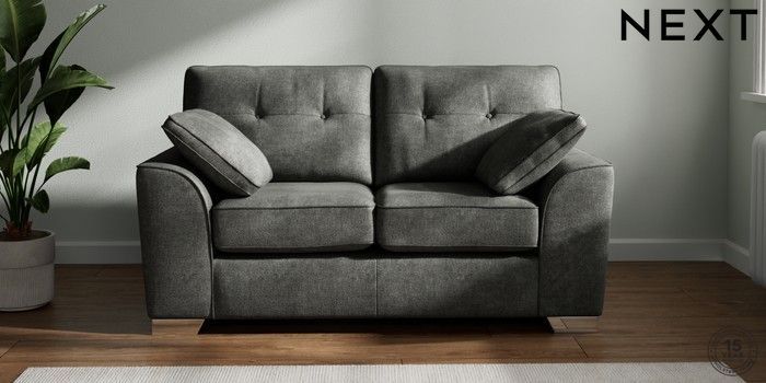 7.2.10 Stamford Buttoned Back 2 Seater Small Sofa Plush Chenille Dark Grey Large Square Angle - Chrome Metal | Made Click here to use our website with more accessibility support, for example screen readers