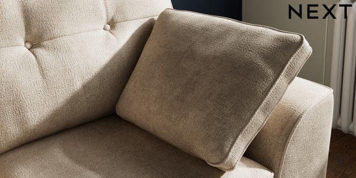 7.2.10 Stamford Buttoned Back 2 Seater Small Sofa Plush Chenille Light Natural Large Square Angle - Brushed Brass | Made Click here to use our website with more accessibility support, for example screen readers