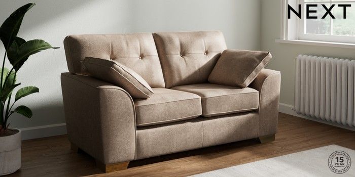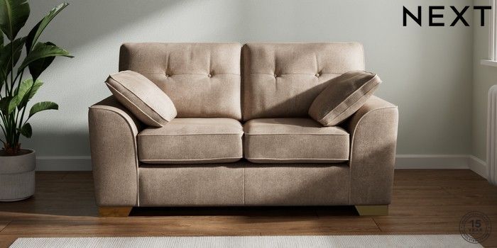 7.2.10 Stamford Buttoned Back 2 Seater Small Sofa Plush Chenille Mid Natural Large Square Angle - Brushed Brass | Made Click here to use our website with more accessibility support, for example screen readers