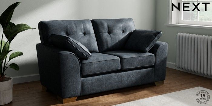 7.2.10 Stamford Buttoned Back 2 Seater Small Sofa Plush Chenille Slate Blue Large Square Angle - Brushed Brass | Made Click here to use our website with more accessibility support, for example screen readers