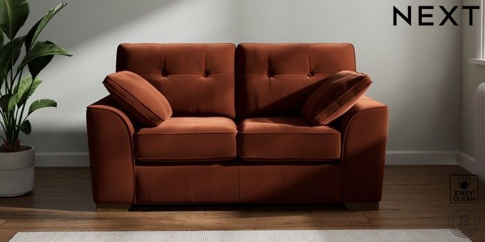 7.2.10 Stamford Buttoned Back 2 Seater Small Sofa Plush Velvet Easy Clean Ginger Orange Large Square Angle - Mid | Made Click here to use our website with more accessibility support, for example screen readers