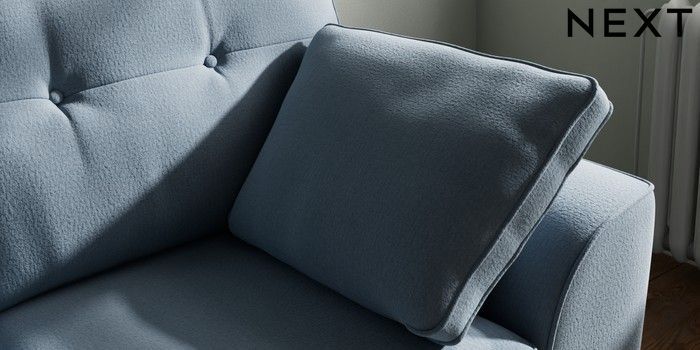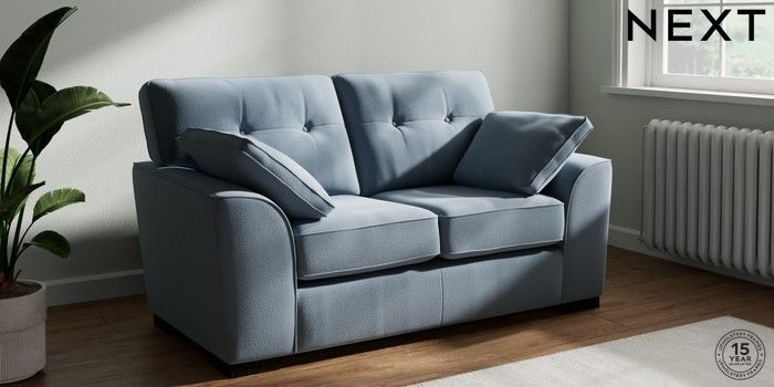7.2.10 Stamford Buttoned Back 2 Seater Small Sofa Relaxed Linen Look Mid Blue Large Square Angle - Dark | Made Click here to use our website with more accessibility support, for example screen readers