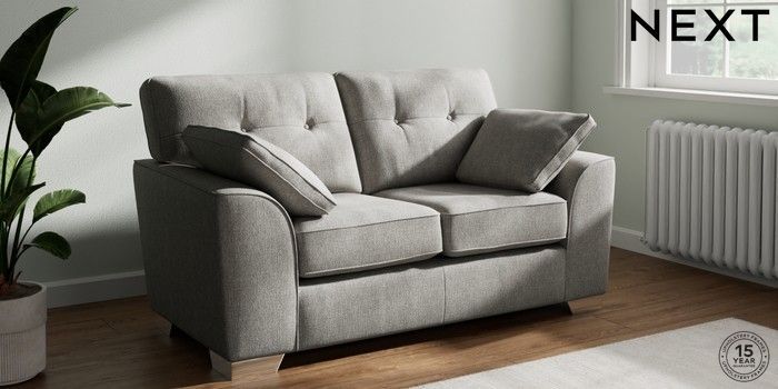 7.2.10 Stamford Buttoned Back 2 Seater Small Sofa Tweedy Chenille Mid Grey Large Square Angle - Chrome Metal | Made Click here to use our website with more accessibility support, for example screen readers