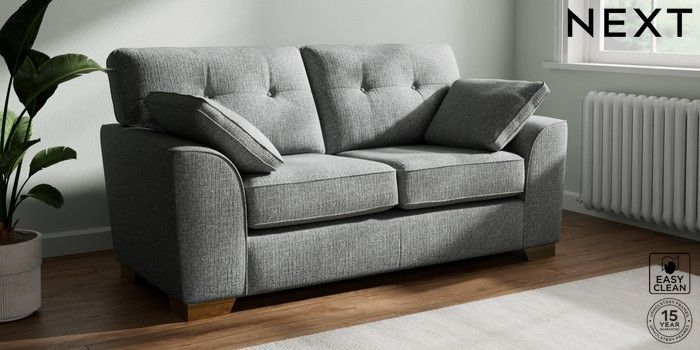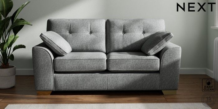 7.2.10 Stamford Buttoned Back 2 Seater Sofa Chunky Boucle Easy Clean Mid Grey Large Square Angle - Brushed Brass | Made Click here to use our website with more accessibility support, for example screen readers