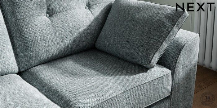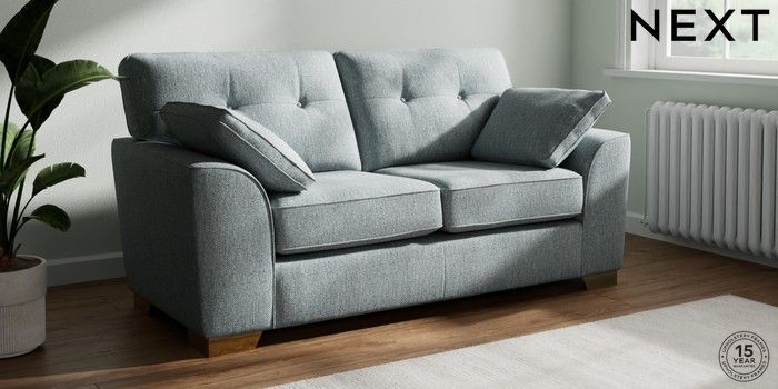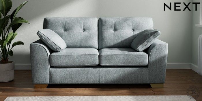 7.2.10 Stamford Buttoned Back 2 Seater Sofa Chunky Weave Mid Blue Large Square Angle - Brushed Brass | Made Click here to use our website with more accessibility support, for example screen readers