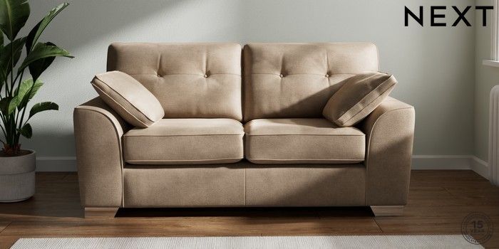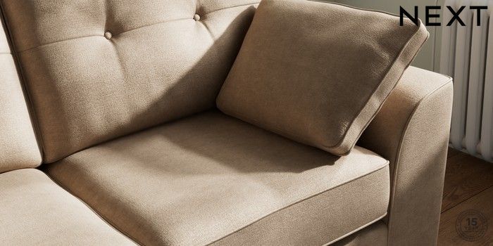 7.2.10 Stamford Buttoned Back 2 Seater Sofa Luxe Chenille Mid Camel Beige Large Square Angle - Chrome Metal | Made Click here to use our website with more accessibility support, for example screen readers