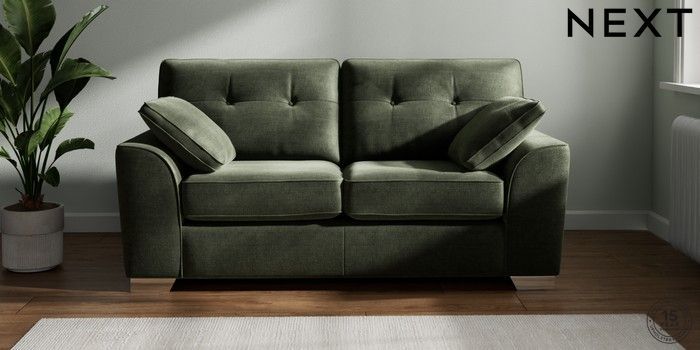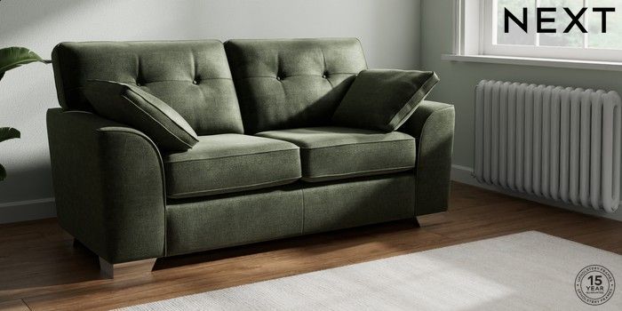 7.2.10 Stamford Buttoned Back 2 Seater Sofa Luxe Chenille Mid Green Large Square Angle - Chrome Metal | Made Click here to use our website with more accessibility support, for example screen readers