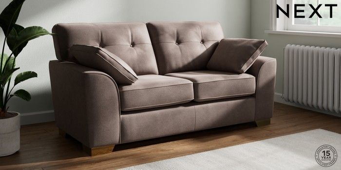 7.2.10 Stamford Buttoned Back 2 Seater Sofa Luxe Chenille Mink Brown Large Square Angle - Brushed Brass | Made Click here to use our website with more accessibility support, for example screen readers