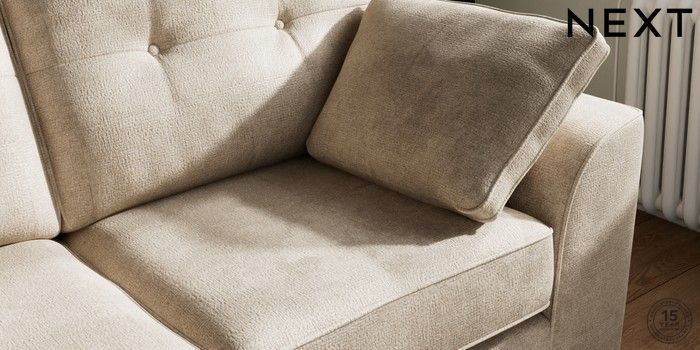 7.2.10 Stamford Buttoned Back 2 Seater Sofa Plush Chenille Light Natural Large Square Angle - Chrome Metal | Made Click here to use our website with more accessibility support, for example screen readers