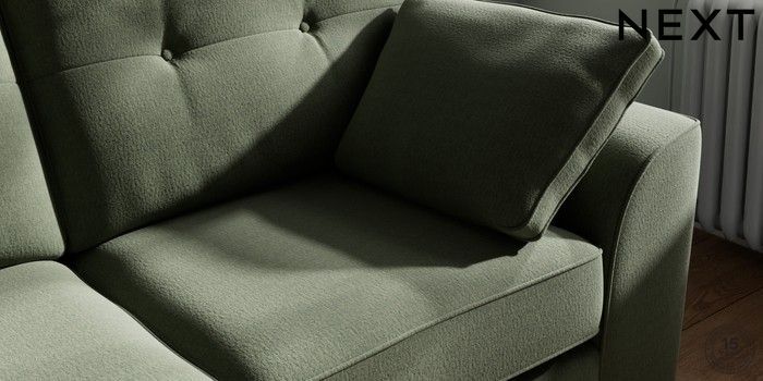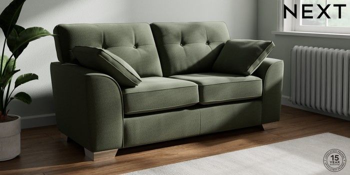 7.2.10 Stamford Buttoned Back 2 Seater Sofa Relaxed Linen Look Dark Green Large Square Angle - Chrome Metal | Made Click here to use our website with more accessibility support, for example screen readers