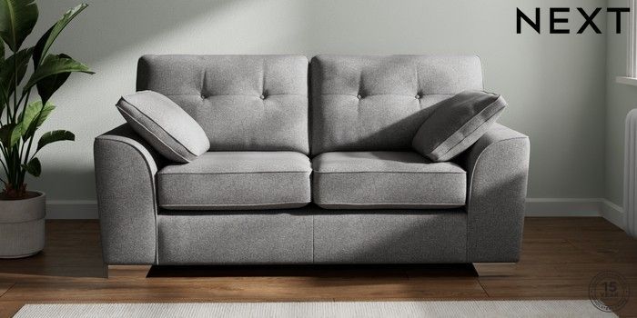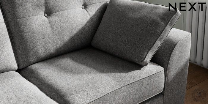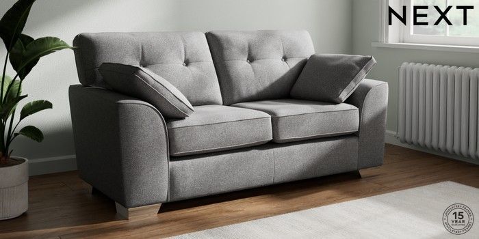 7.2.10 Stamford Buttoned Back 2 Seater Sofa Studio Chenille Mid Grey Large Square Angle - Chrome Metal | Made Click here to use our website with more accessibility support, for example screen readers