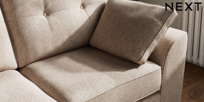 7.2.10 Stamford Buttoned Back 2 Seater Sofa Tweedy Chenille Mid Natural Large Square Angle - Brushed Brass | Made Click here to use our website with more accessibility support, for example screen readers