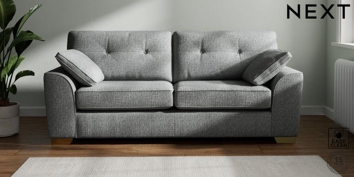 7.2.10 Stamford Buttoned Back 3 Seater Sofa Chunky Boucle Easy Clean Mid Grey Large Square Angle - Brushed Brass | Made Click here to use our website with more accessibility support, for example screen readers