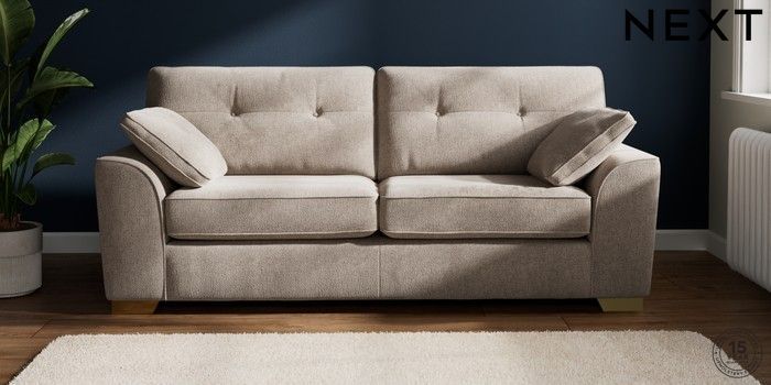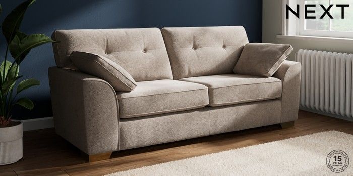 7.2.10 Stamford Buttoned Back 3 Seater Sofa Chunky Chenille Light Dove Large Square Angle - Brushed Brass | Made Click here to use our website with more accessibility support, for example screen readers