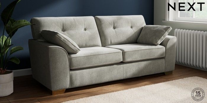 7.2.10 Stamford Buttoned Back 3 Seater Sofa Chunky Chenille Light Grey Large Square Angle - Brushed Brass | Made Click here to use our website with more accessibility support, for example screen readers