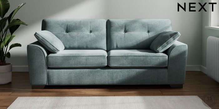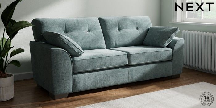 7.2.10 Stamford Buttoned Back 3 Seater Sofa Chunky Chenille Light Teal Green Large Square Angle - Gunmetal | Made Click here to use our website with more accessibility support, for example screen readers