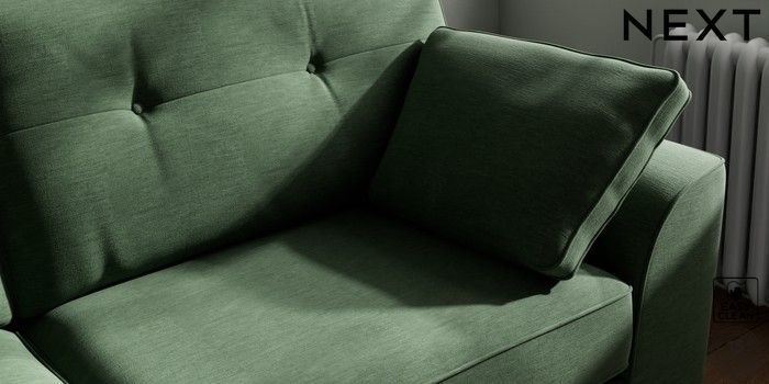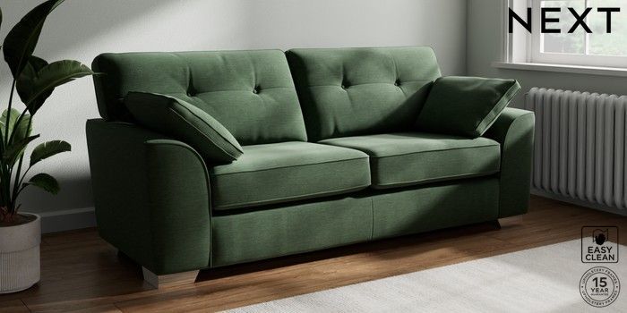 7.2.10 Stamford Buttoned Back 3 Seater Sofa Fine Chenille Easy Clean Mid Khaki Green Large Square Angle - Chrome Metal | Made Click here to use our website with more accessibility support, for example screen readers