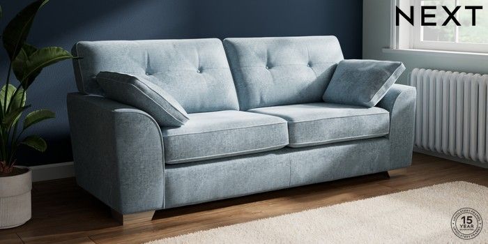 7.2.10 Stamford Buttoned Back 3 Seater Sofa Plush Chenille Light Blue Large Square Angle - Chrome Metal | Made Click here to use our website with more accessibility support, for example screen readers