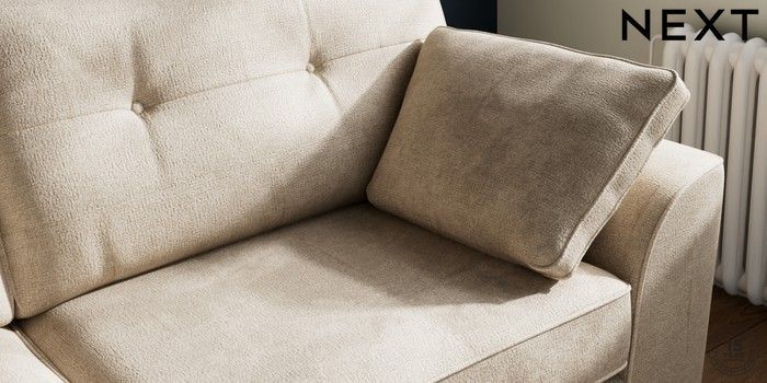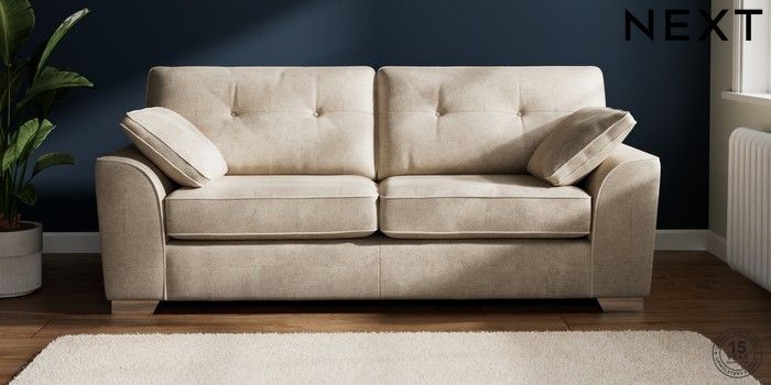 7.2.10 Stamford Buttoned Back 3 Seater Sofa Plush Chenille Light Natural Large Square Angle - Chrome Metal | Made Click here to use our website with more accessibility support, for example screen readers