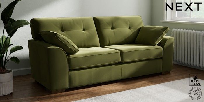 7.2.10 Stamford Buttoned Back 3 Seater Sofa Plush Velvet Easy Clean Mid Olive Green Large Square Angle - Mid | Made Click here to use our website with more accessibility support, for example screen readers