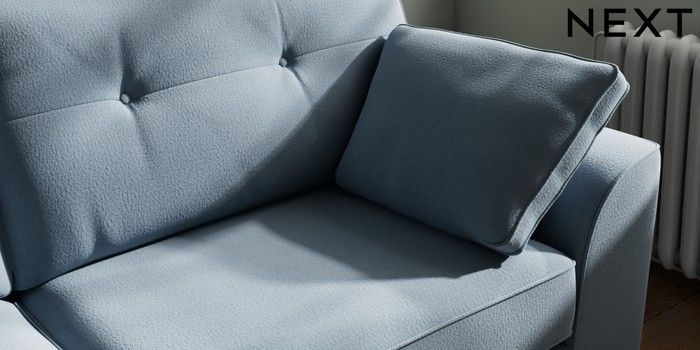 7.2.10 Stamford Buttoned Back 3 Seater Sofa Relaxed Linen Look Mid Blue Large Square Angle - Chrome Metal | Made Click here to use our website with more accessibility support, for example screen readers