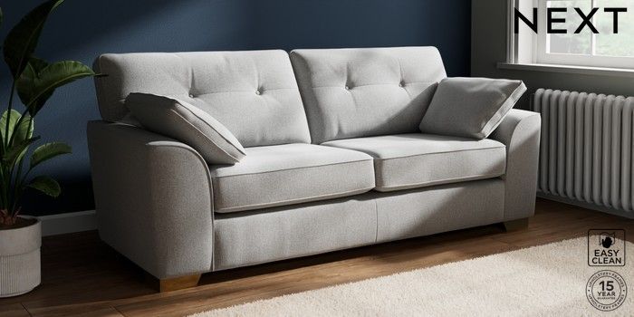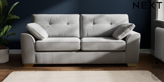 7.2.10 Stamford Buttoned Back 3 Seater Sofa Tweedy Blend Easy Clean Light Silver Grey Large Square Angle - Brushed Brass | Made Click here to use our website with more accessibility support, for example screen readers