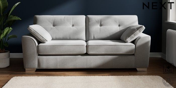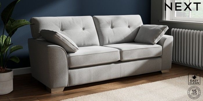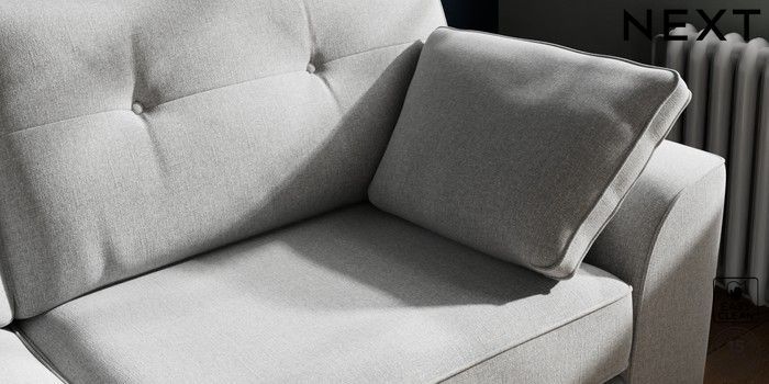 7.2.10 Stamford Buttoned Back 3 Seater Sofa Tweedy Blend Easy Clean Light Silver Grey Large Square Angle - Chrome Metal | Made Click here to use our website with more accessibility support, for example screen readers