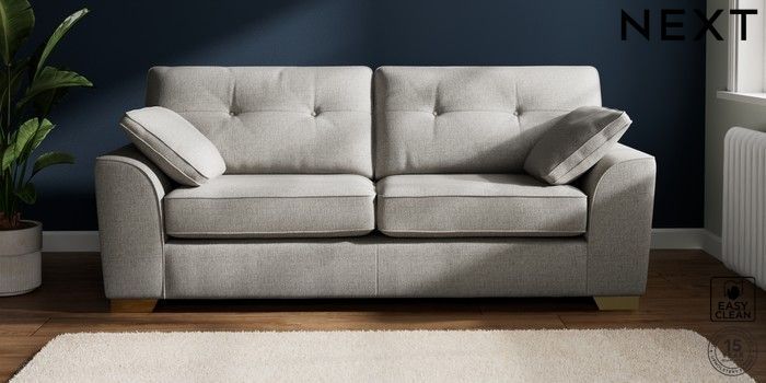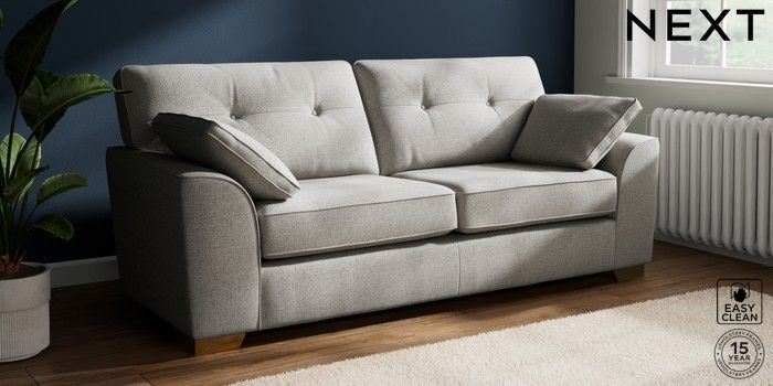 7.2.10 Stamford Buttoned Back 3 Seater Sofa Woven Chenille Easy Clean Light Grey Large Square Angle - Brushed Brass | Made Click here to use our website with more accessibility support, for example screen readers