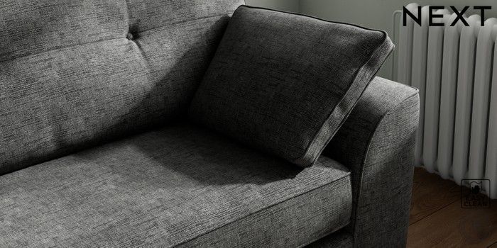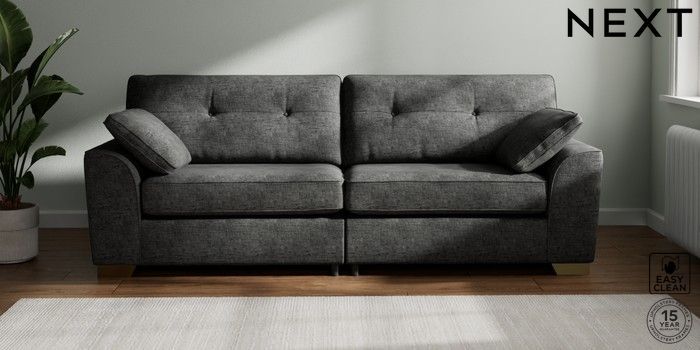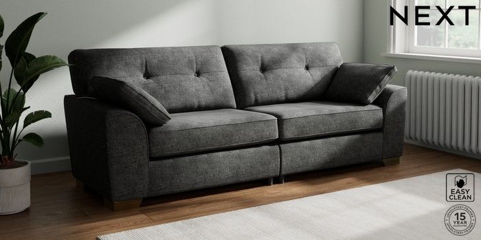 7.2.10 Stamford Buttoned Back 4 Seater Sofa Boucle Weave Easy Clean Charcoal Grey Large Square Angle - Brushed Brass | Made Click here to use our website with more accessibility support, for example screen readers