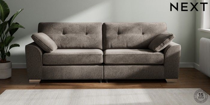 7.2.10 Stamford Buttoned Back 4 Seater Sofa Chunky Chenille Mink Brown Large Square Angle - Chrome Metal | Made Click here to use our website with more accessibility support, for example screen readers