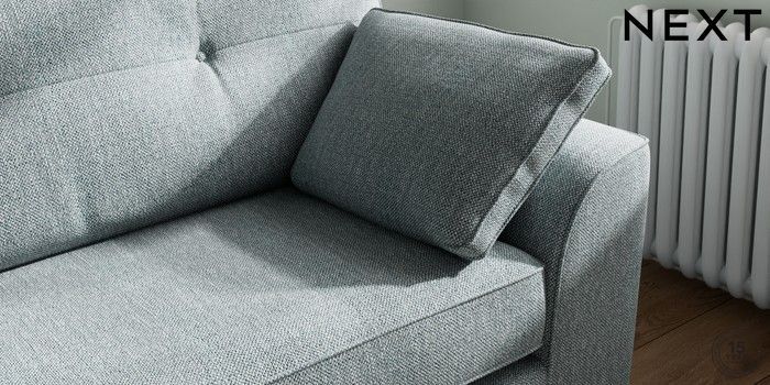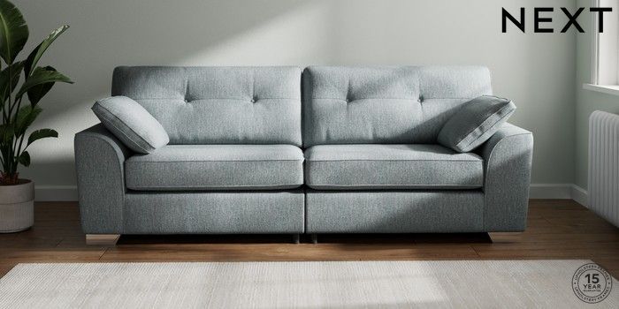 7.2.10 Stamford Buttoned Back 4 Seater Sofa Chunky Weave Mid Blue Large Square Angle - Chrome Metal | Made Click here to use our website with more accessibility support, for example screen readers