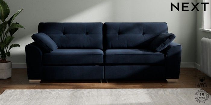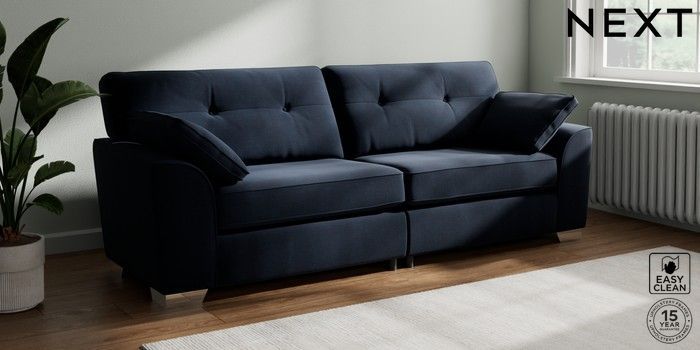 7.2.10 Stamford Buttoned Back 4 Seater Sofa Fine Chenille Easy Clean Dark Navy Blue Large Square Angle - Chrome Metal | Made Click here to use our website with more accessibility support, for example screen readers