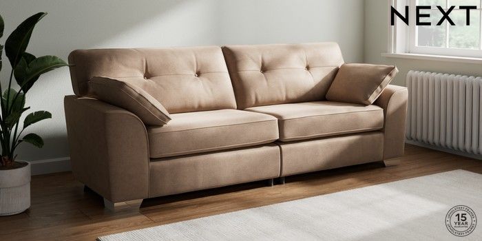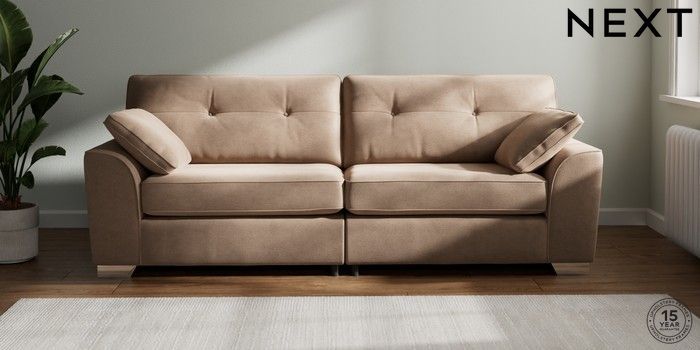 7.2.10 Stamford Buttoned Back 4 Seater Sofa Luxe Chenille Mid Natural Large Square Angle - Chrome Metal | Made Click here to use our website with more accessibility support, for example screen readers
