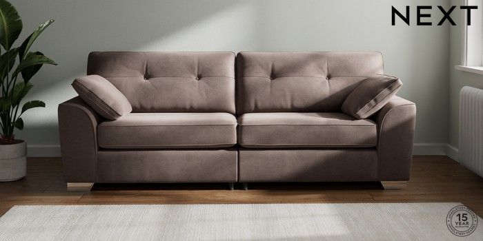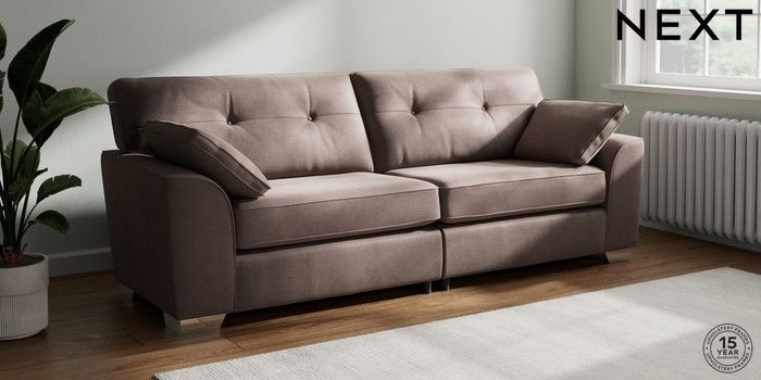 7.2.10 Stamford Buttoned Back 4 Seater Sofa Luxe Chenille Mink Brown Large Square Angle - Chrome Metal | Made Click here to use our website with more accessibility support, for example screen readers