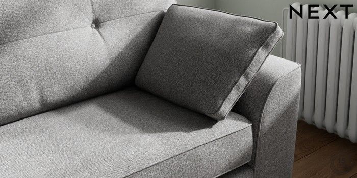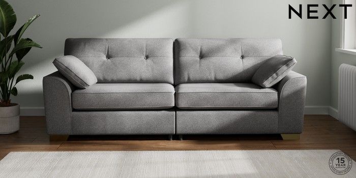 7.2.10 Stamford Buttoned Back 4 Seater Sofa Studio Chenille Mid Grey Large Square Angle - Brushed Brass | Made Click here to use our website with more accessibility support, for example screen readers