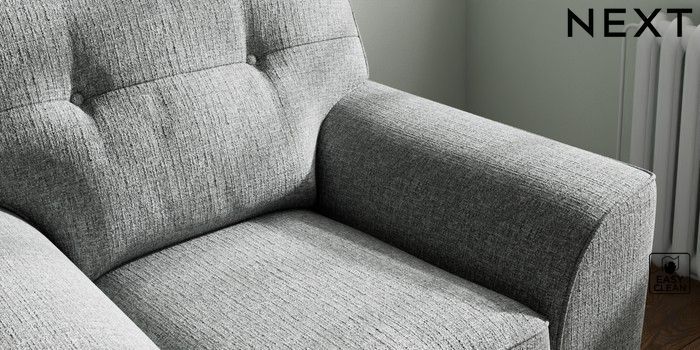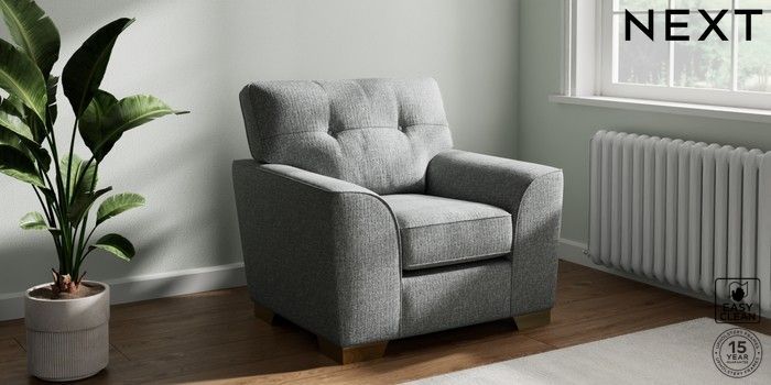 7.2.10 Stamford Buttoned Back Armchair Chunky Boucle Easy Clean Mid Grey Square Angle - Brushed Brass | Made Click here to use our website with more accessibility support, for example screen readers