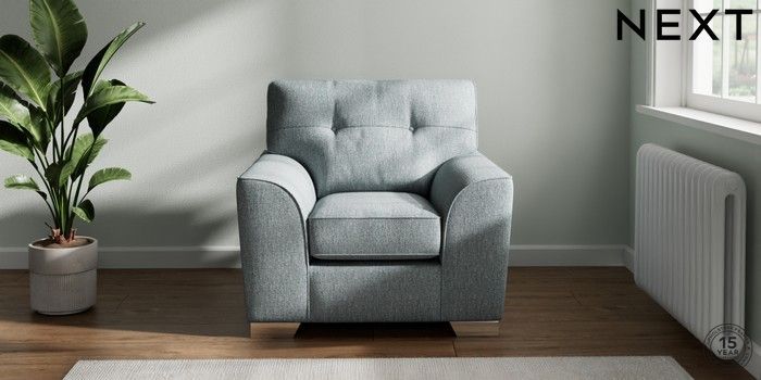 7.2.10 Stamford Buttoned Back Armchair Chunky Weave Mid Blue Square Angle - Chrome Metal | Made Click here to use our website with more accessibility support, for example screen readers