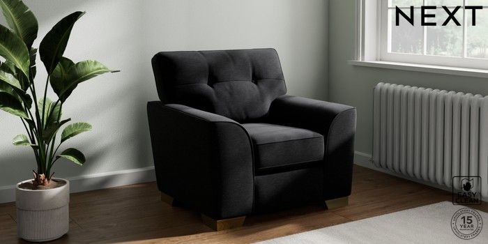7.2.10 Stamford Buttoned Back Armchair Fine Chenille Easy Clean Black Square Angle - Brushed Brass | Made Click here to use our website with more accessibility support, for example screen readers